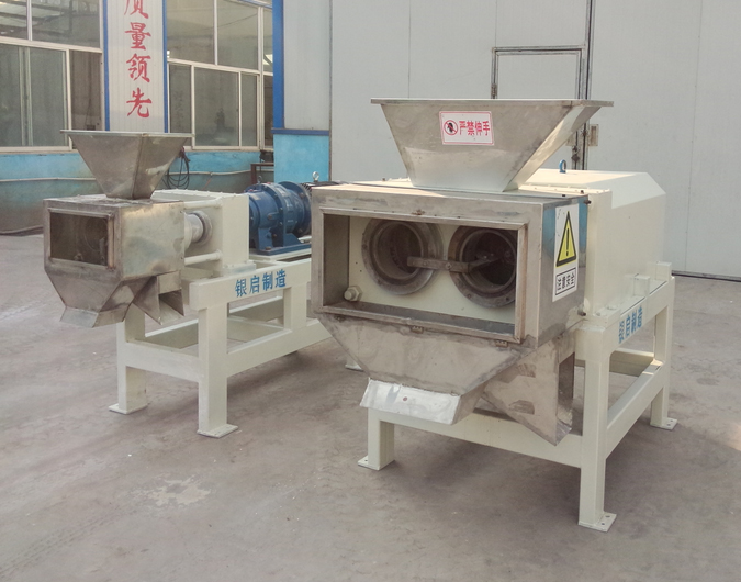 對齒造粒機是有兩個非標空心齒輪(齒底鉆孔,孔徑根據(jù)造粒要求而定),相互咬合轉(zhuǎn)動,物料通過齒輪的齒槽,在相互咬合產(chǎn)生的擠壓作用下,從齒底的孔眼中擠出。再有齒輪內(nèi)腔中的切刀把物粒切斷,形成顆粒。